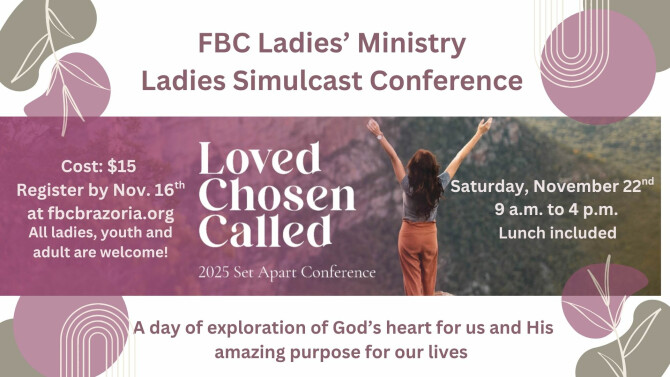 FBC, Brazoria Ladies’ Ministry will host the Loved, Chosen, Called Simulcast with Leslie Ludy, an event that brings women together for a day of exploration of God's heart for us and His amazing purpose for our lives.